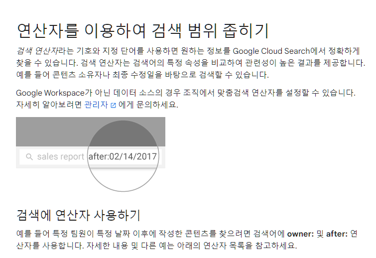 특정 날짜 이후에 수정된 콘텐츠를 검색합니다. | 문서 after:2023/01/01 - 눌러서 사용하세요 |